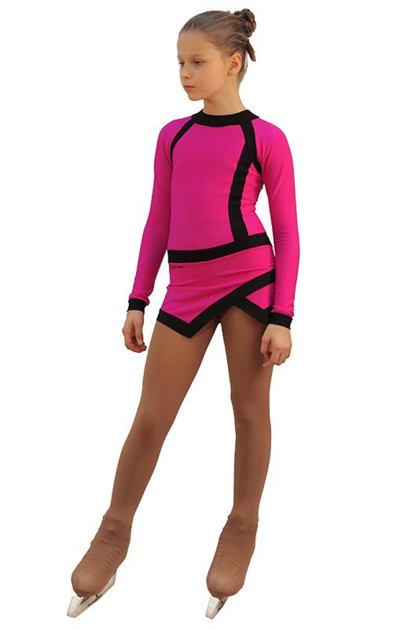 The contrasting colour combination, bright sporty design and the original designer’s solution were the basic points when creating this model. Asymmetrical lines of a complex configuration, the sporty design of the skirt, Raglan sleeve and fit – all this attracts the eye. In this dress your child will be guaranteed to stand out on the ice and feel like a leader.