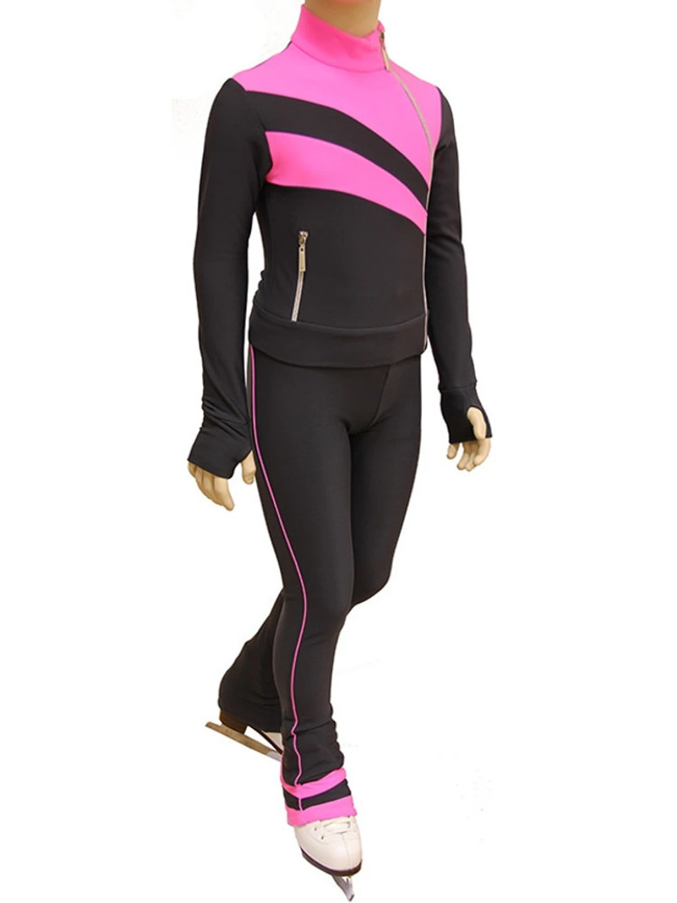 Training outfit βRaysβ for figure skating is made of Vuelta The kit includes jacket and pants. Jacket features asymmetrical panels and a zip closure, which is an interesting element of decor and unusual design solution. Cuff – gloves, stand – up collar. Pants are also asymmetrical and decorated with stripes – piping and curved panels of fabric of a different color. Vuelta – the warm, soft, fastness fabric with inner fleece and a beautiful tension in all directions. Excellent thermal insulation properties, optimum breathability and antibacterial treatment that prevents the spread of germs, make this costume out of fabric Vuelta for guests.